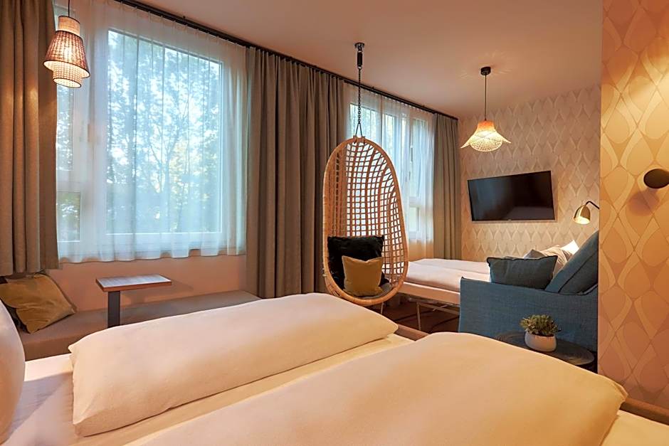 Quiet double room featuring a rain-dance shower, cocoon-cabin with integrated workplace, flat-screen TV, and free WiFi. Rooms have soundproofed windows and air conditioning.